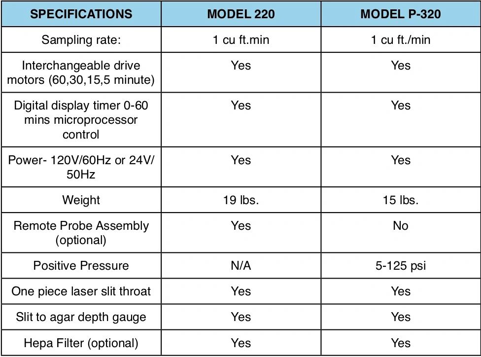 On operation, the pressure of the compressed gas (maximum 125 psi, minimum 5 psi) is reduced by a constant pressure reducing regulator pass through a 0.152mm slit, and the resident particles contained therein impinged upon an agar surface 2-3mm below the slit. The agar is contained in the same commercially available culture plate as described for Model 220.